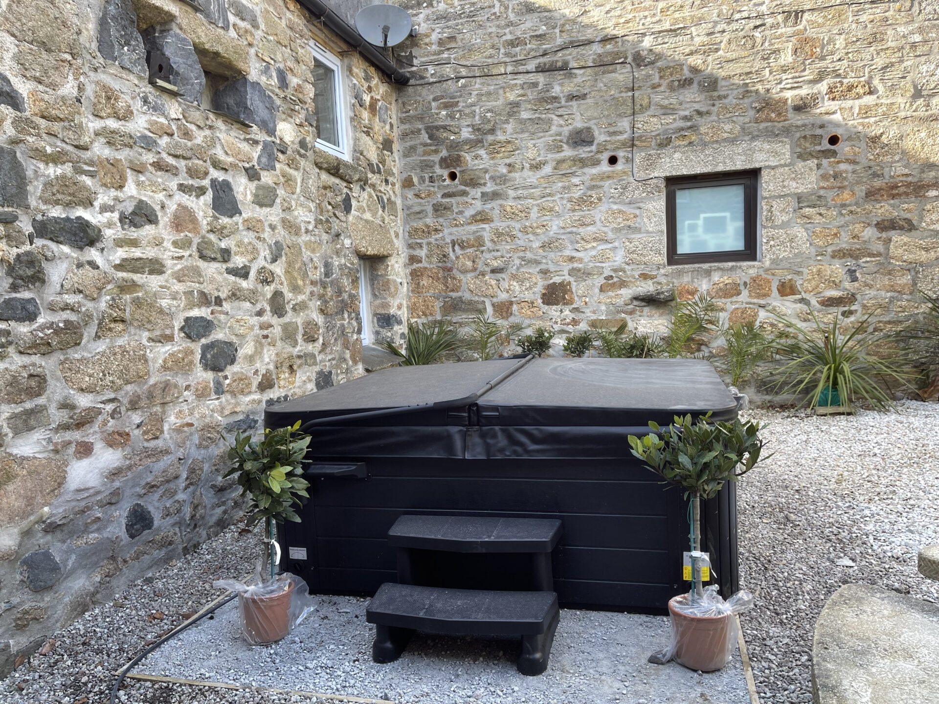 A stone-walled courtyard adorned with greenery and providing an oasis in which to relax with a glass of wine or G & T, or simply unwind in the hot tub underneath the sun or stars..